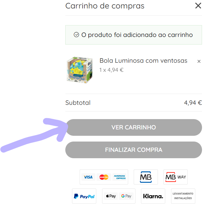 Irá surgir uma página deslizante do lado direito onde deve carregar: ver Carrinho.