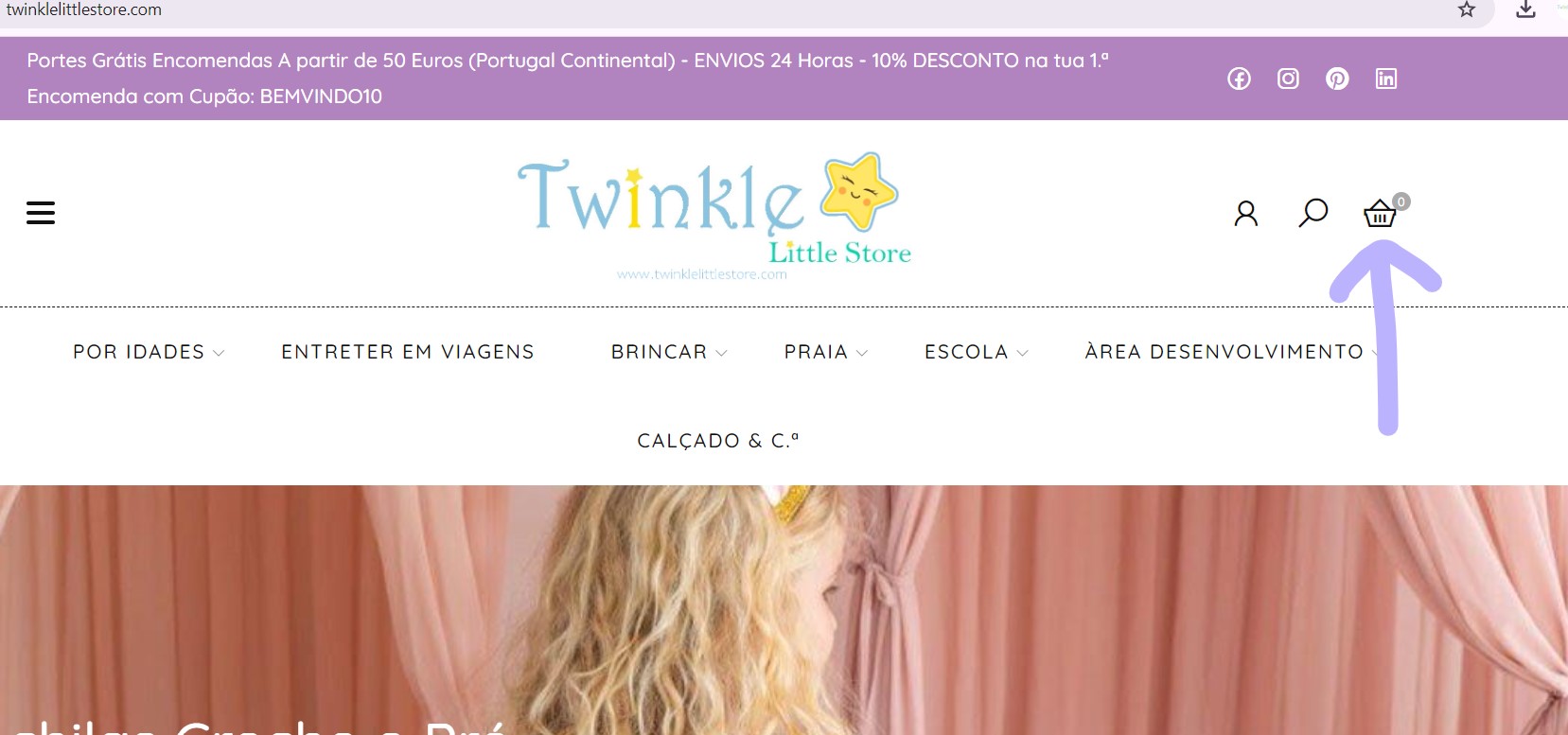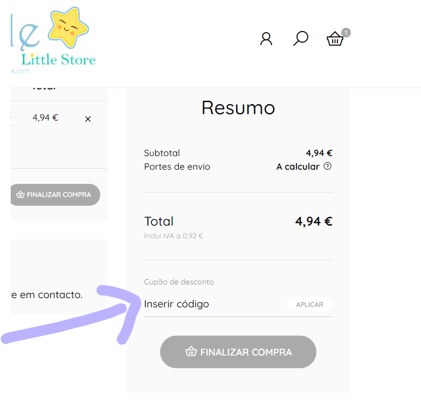 Na página que se segue deve adicionar o Cupão de desconto no lado direito da página, por baixo do total da sua encomenda no campo Inserir código e carregar em Aplicar.